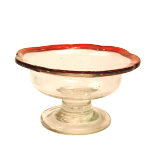 輪花状の口辺にくっきりした金赤の氷コップ。少し平たい形状が面白い。山梨:六曜館で購入。